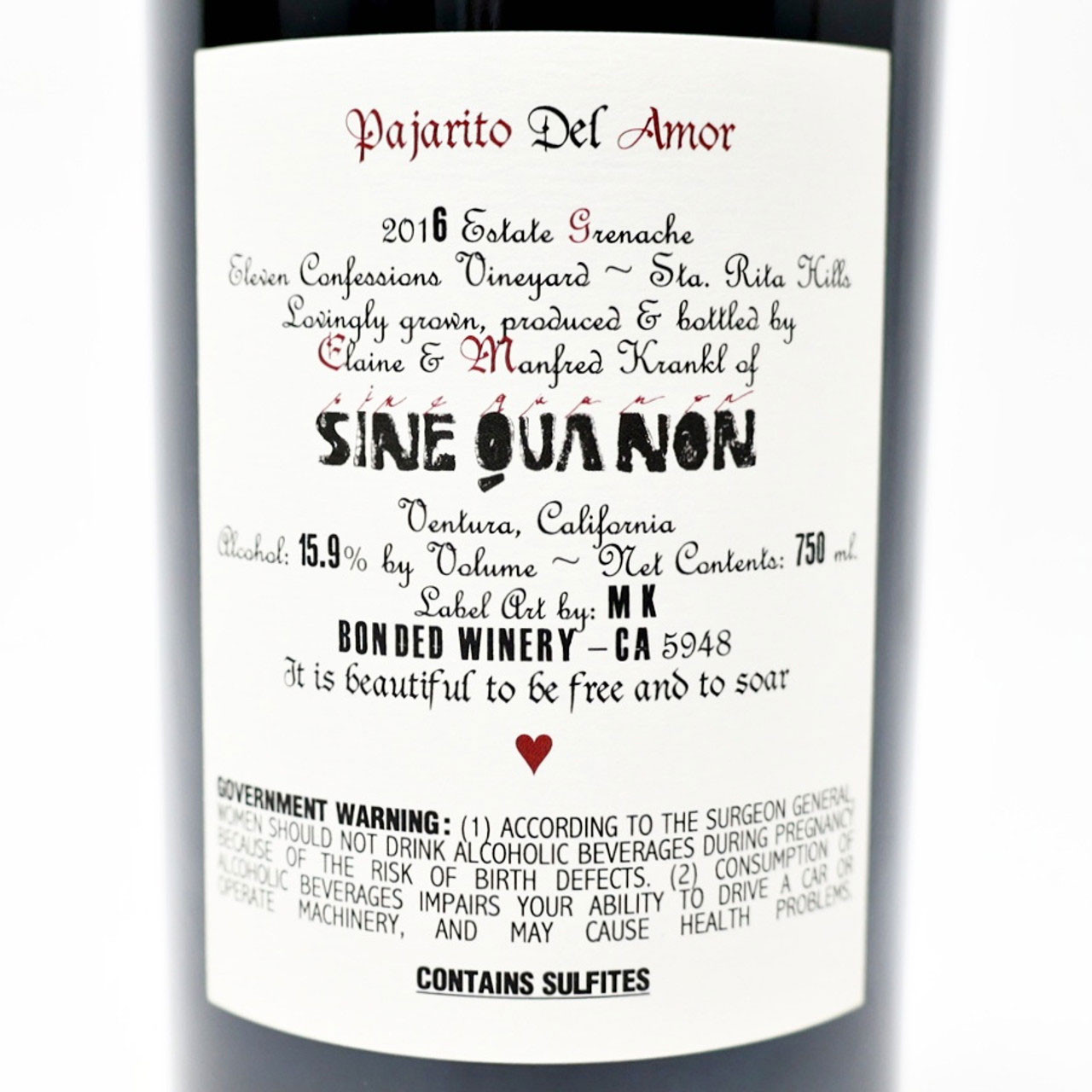 Sine Qua Non Grenache "Pajarito del Amor" Eleven Confessions Vyd 2016