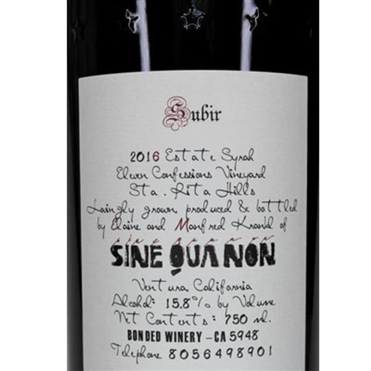 99 points Lisa Perrotti-Brown (Wine Advocate): "The 2016 Syrah SUBIR (meaning to rise or go up) is a single-vineyard wine—a barrel selection from the Eleven Confessions estate vineyard in Sta. Rita Hills... A blend of 89.7% Syrah, 4.6% Grenache, 2.5% Petite Sirah and 3.2% Viognier, this wine was made using 44% whole cluster. It was then reared for 38 months in barrel. Eighty-two percent of the wine was aged in new, French oak, while the remainder was aged in used barrels (one to five years old). Very deep purple-black, it comes bounding out of the glass with precociously profound notes of baked blackberries, plum preserves, blueberry pie, tilled earth and lilacs plus tobacco leaf, wild sage, truffles and espresso nuances. Medium to full-bodied, the palate is tautly structured, strutting a firm backbone of rounded tannins and fantastic freshness supporting the muscular, tightly wrapped layers, finishing with epic length and loads of minerally fireworks. (8/31/20)" 98 points Antonio Galloni (Vinous): "The 2016 Syrah Subir, from Elaine and Manfred Krankl's Eleven Confessions ranch, is a powerhouse. It is the rare Sine Qua Non wine that demands cellaring. Swaths of tannin wrap around a core of inky dark fruit. Hints of spice, lavender, mint and dried herbs emerge with coaxing, but the 2016 is in no mood to show all of its cards yet. Subir is 89.7% Syrah, 4.6% Grenache, 2.5% Petite Siraha and 3.2% Viognier, vinified with 44% whole clusters. It is projected to spend 38 months in oak, 82% new. Drink: 2024-2031. (Aug 2020)"